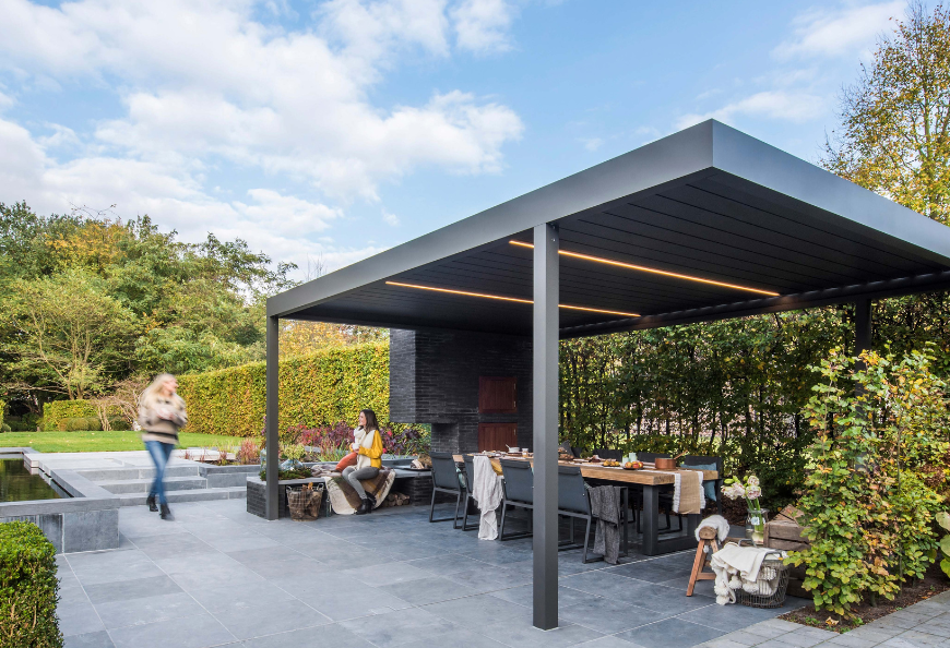 Terrassenüberdachung mit drehbaren Lamellen und perfekter Integration von Seitenelementen und Accessoires.